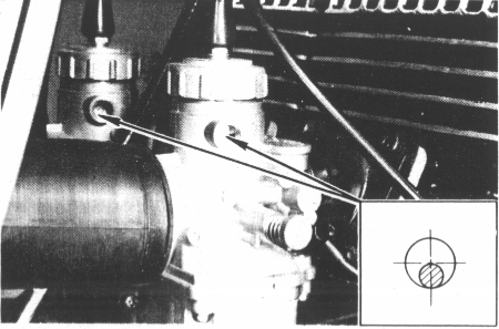 beim rechten Vergaser also an der Innenseite des Vergasers. Die Leerlauf-Luftregulierschraube